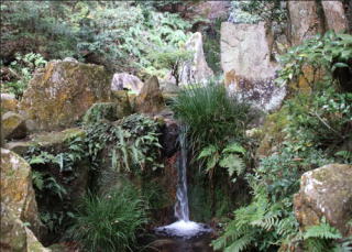 茶室から庭の奥には2つ目の滝「梵音の滝」があります。約50mの絶壁の3段から落ちてくる滝は別名「大滝」と呼ばれ誠に見事です