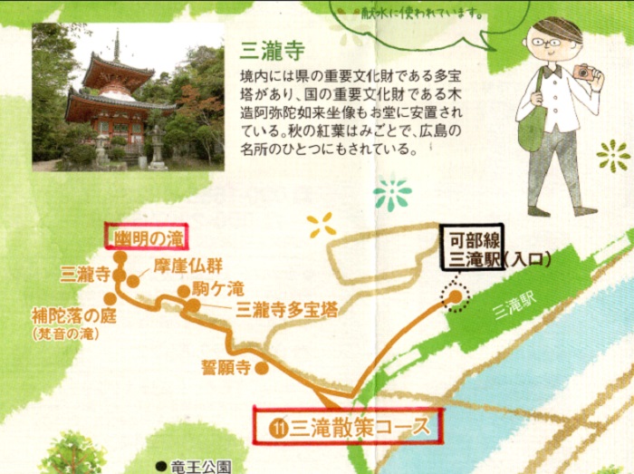 弘法大師がこれぞ聖地なりと言ったと伝えられる三滝、三瀧寺の境内にはその名の由来ともなった三つの滝が流れ、四季折々美しい自然の姿を見せてくれます。深山幽谷の趣きも深く、多くの石佛や文学碑、原爆慰霊碑などもあり、滝の瀬音を聞きながらの散策は心が癒されます。また、境内には、県の重要文化財の朱色の多宝塔があり、塔内には国の重要文化財である木造阿弥陀如来坐像が安置されています。